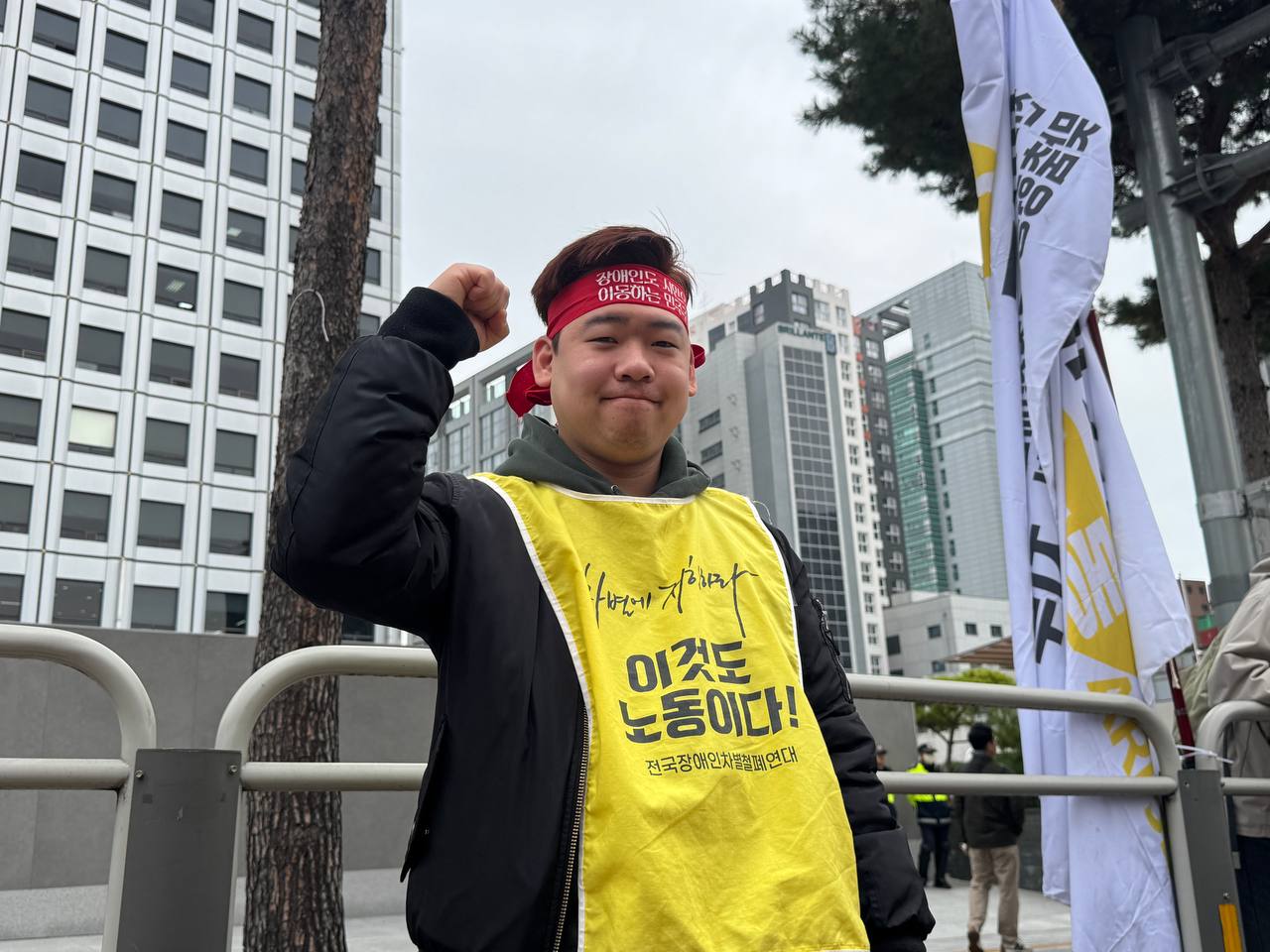 전 노들야학 교사 겸 박규형 님 활동지원인으로 노동자대회를 참여했는데요. 우선 규형 님이 참여의지가 커서 기분이 좋았어요. 이번 투쟁이 본인의 일자리와 관련됐다는 걸 분명히 알고 참여하셨고요 전날부터 준비물(선전 문구가 적힌 머리띠)을 준비하는 모습을 봤는데, 신나 보인다고 해야 할까요? 그런 모습을 보니 저도 신나는 기분이 들었고요. 마지막으로 이번 노동자 본 대회에서 장판은 행진에 참여했는데 본 무대에서도 권리중심공공일자리를 의제로써 다루고 선전할 수 있었으면 좋았겠다는 생각을 했습니다.(김진수 | 노들장애인야학 교사, 박규형 활동지원사) |