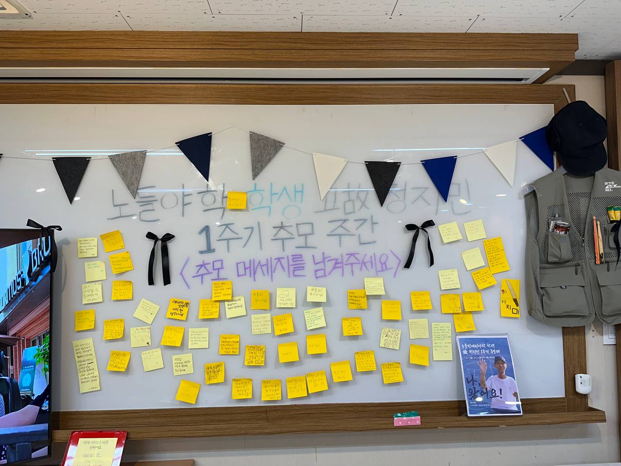 저는 임당, 용수, 창현과 함께 추모제 준비팀으로 참여해서 추모제 전까지 진행되는 추모 기간을 준비했습니다. 들다방에 추모 공간을 같이 꾸렸어요. 지민 님이 노들에서 같이 활동하셨던 모습들, 남기고 가신 조끼와 모자. 레쓰비. 드럼스틱. 담배. 이렇게까지 형을 생각나게 만들다니 너무하다며, 울면서 웃었습니다. 🥲